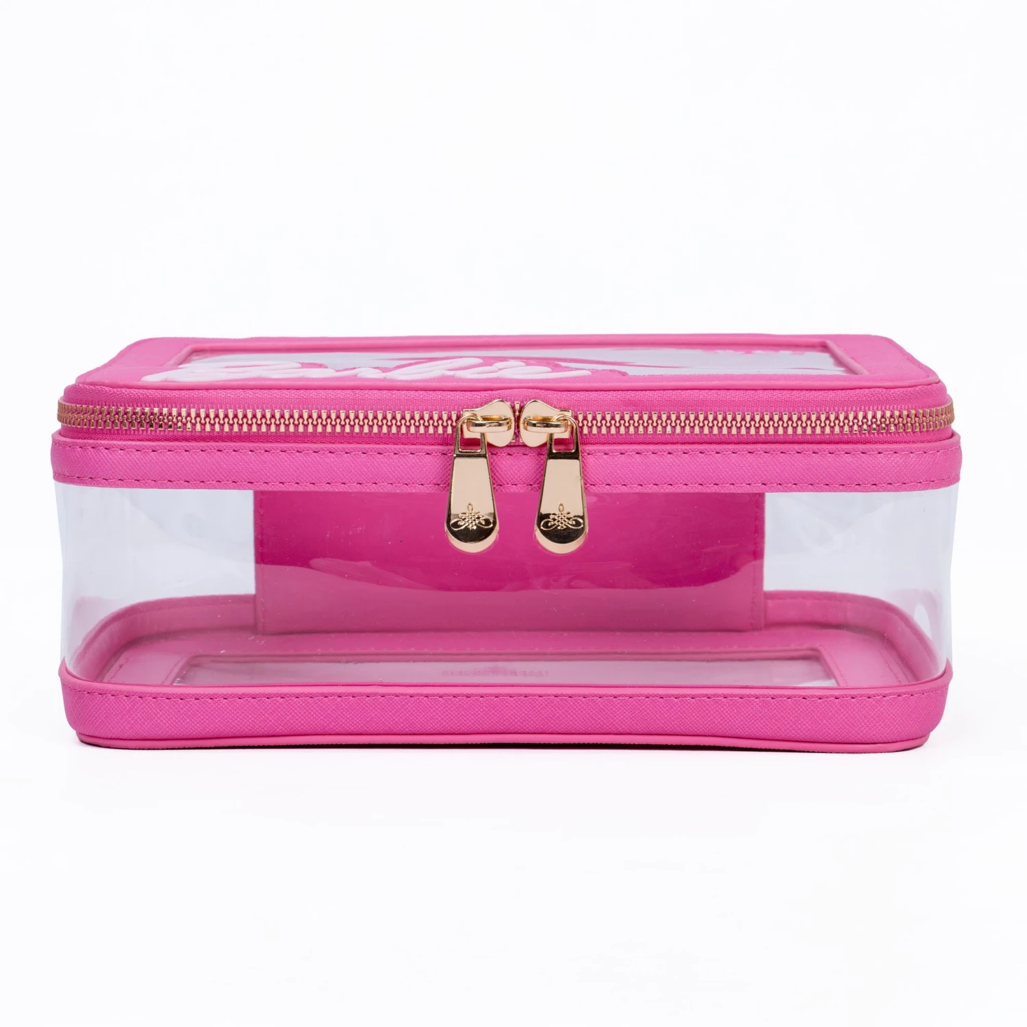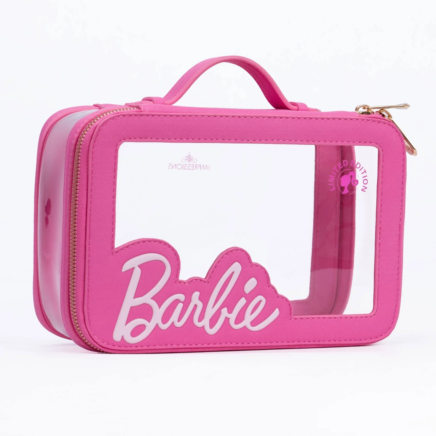 Bring your beauty essentials with you in this Barbie Makeup Carry Case. This special edition carrier features a puff embossed Barbie logo on the front, and transparent panels making it easy to find the items you need in style. Designed for convenience and style, it comes with a comfortable top handle, a roomy interior to accommodate all your daily must-haves, and a gold-branded Impressions Vanity zipper for that touch of luxury. The classic Barbie pink finish adds a pop of color and a dash of personality to your beauty arsenal.