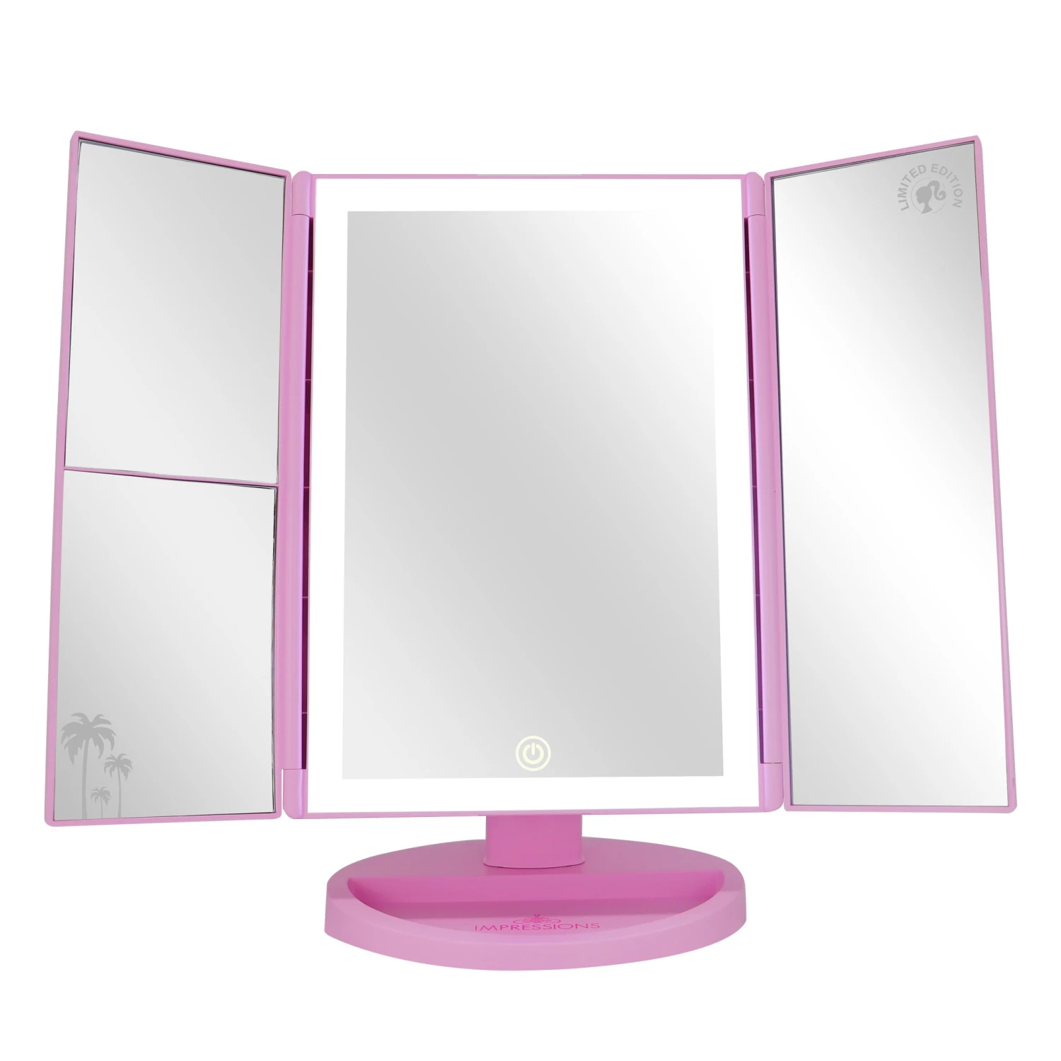 Upgrade your makeup routine with the charming Barbie Trifold LED Tri-Tone Makeup Mirror with Magnification. Adorned with a Beach Dreams print on the exterior, it infuses a touch of California vibes into your beauty regimen.