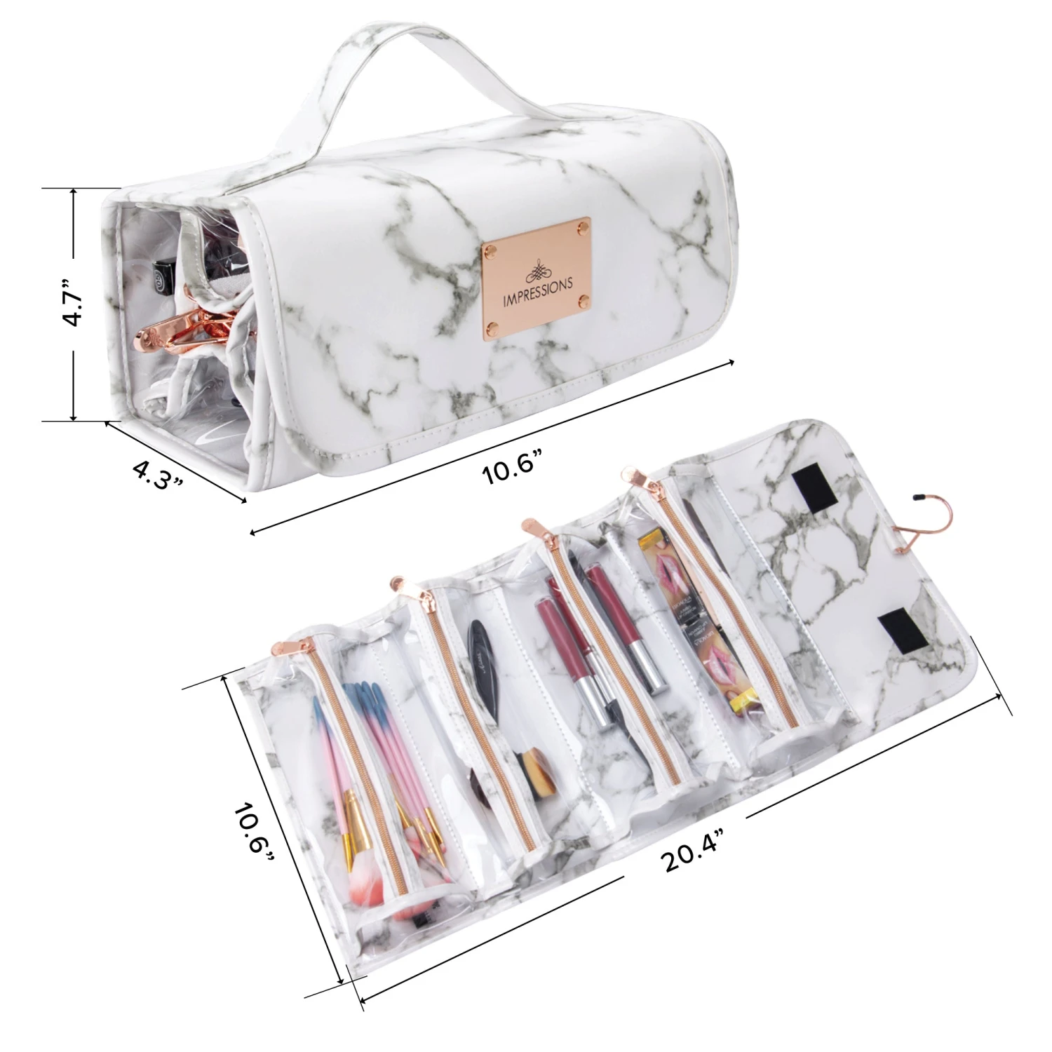 Roll up and razzle-dazzle with the beautiful marble printed Capri Hanging Cosmetic Bag. A portable makeup carry case that is also water resistant. This gorgeous yet multi-purpose bag is made with high-quality faux leather and accented with rose gold zippers and a rose gold hanger.