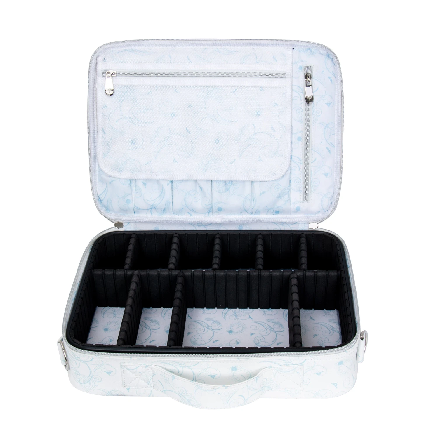 The CinderellaMakeup Carry Caseis fit for a princess! With itswhimsical, Cinderella print and silveraccents, it’s sure to leave a stunning impression.It includes an adjustable strap for you to carry onyour shoulder or slip onto your luggage handle with the trolley sleeve located on the back. This casefeatures plenty of pockets to store brushes witha built-in protective vinyl cover to keep your brushes in mint condition. The zippered pockets can be used to store any necessities from your favorite blush to a jade roller.Removable dividers make it easy for you to customize your compartments to your needs.