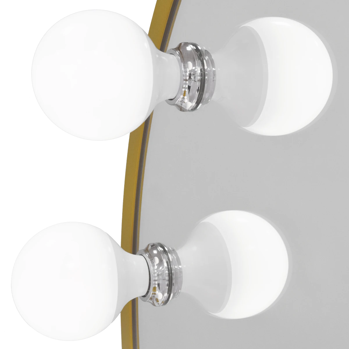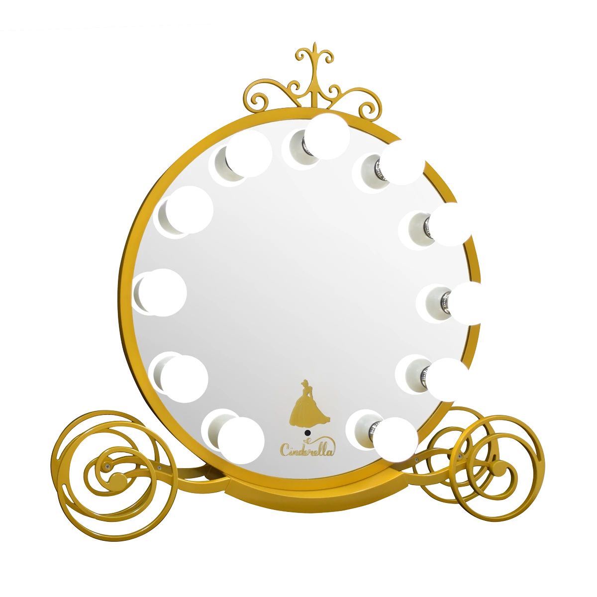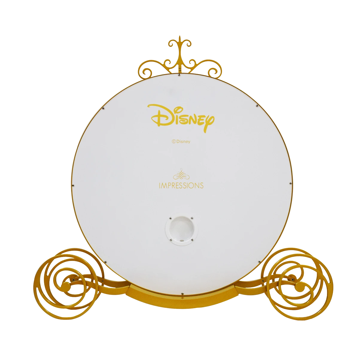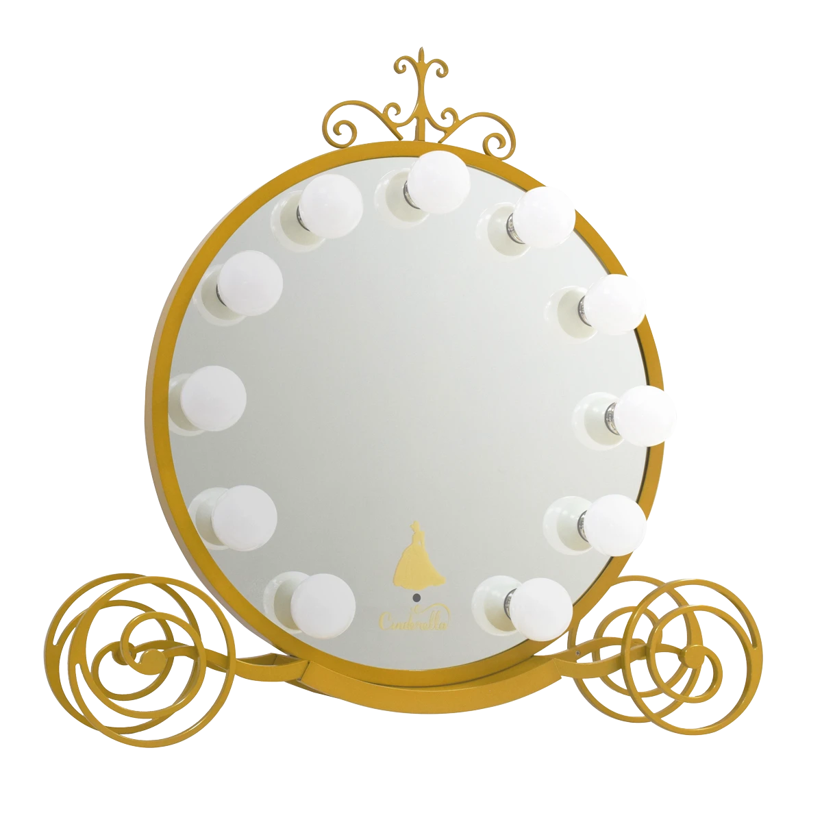 Cinderellas signaturepumpkin carriage now reimagined into a designer vanity mirror. This gorgeous piece is plated with a beautiful bright gold metal finish. Eleven LED bulbs encapsulate the front of the large, premium mirror. Featuring a whimsical motion sensor light switch; simply wave your hand in front of the mirror to switch from on, off, or to adjust brightness. Enchant your home with this magical Disneys Cinderella themedmirror.