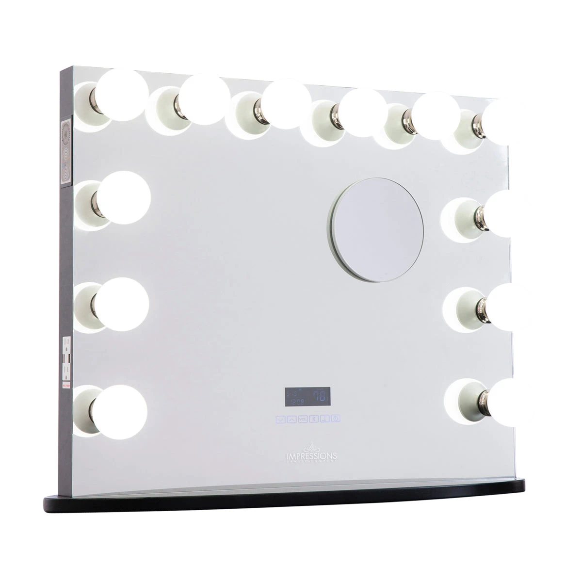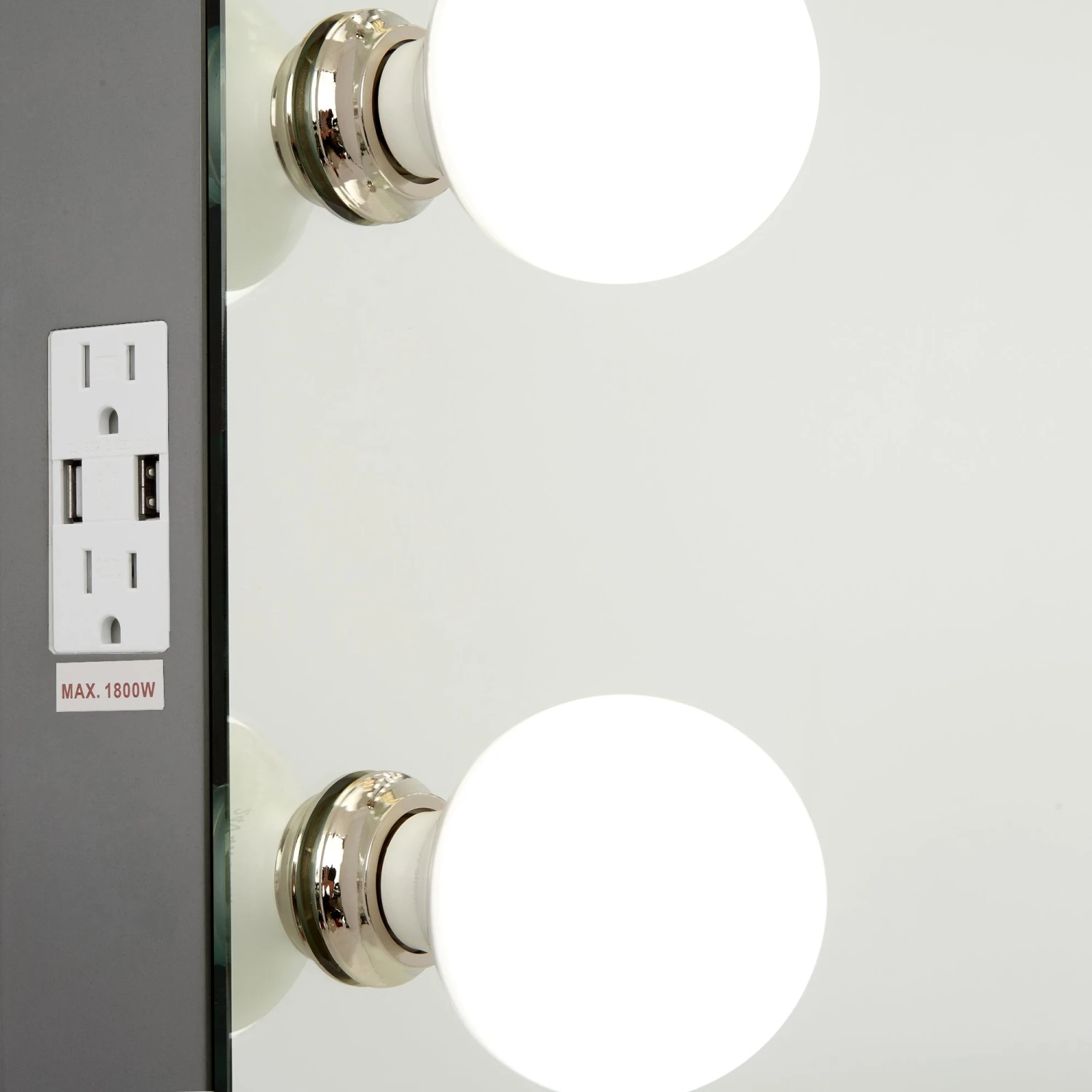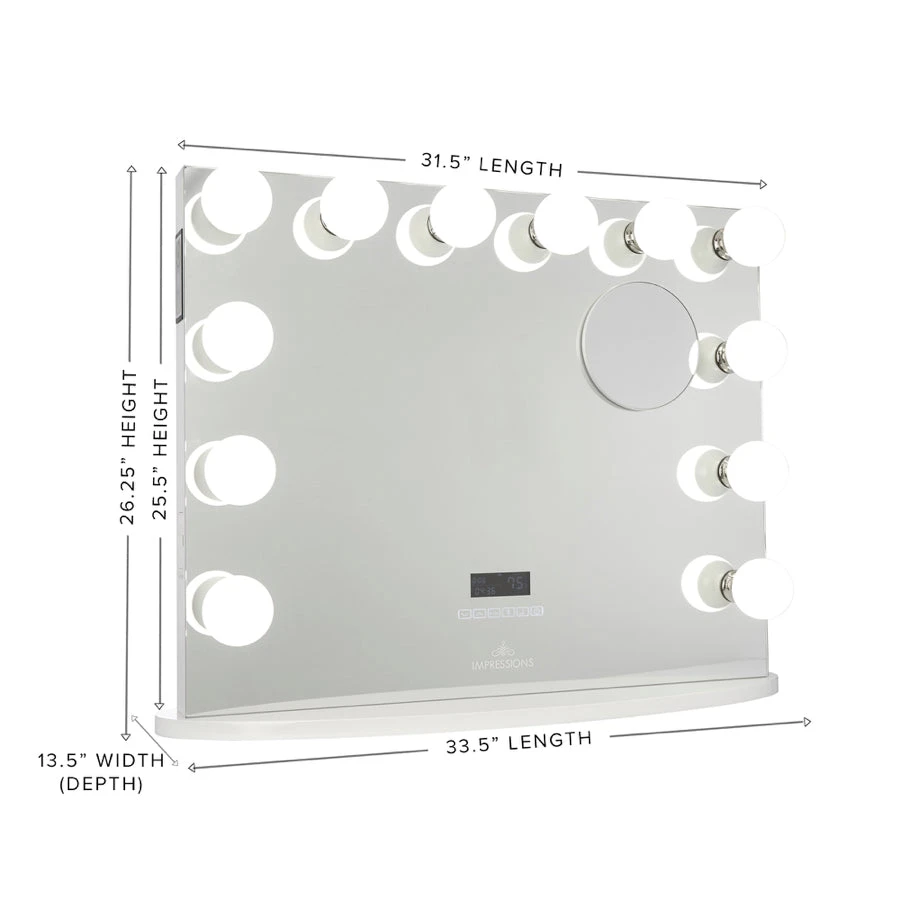 The Impressions Vanity HollywoodPremiere Plus Vanity Mirror is the classic vanity experiencetheHollywood Glam design that provides perfect, even lighting and superior mirror reflection clarity. Featuring 12 light sockets for bright lighting equipped with a dimmer switch and convenient USB andpower outlets. The mirror is encased ina robust aluminum body that can easily be wall-mounted with the pre-installed mounting hardwareormount it on aSlayStationwith the included base!