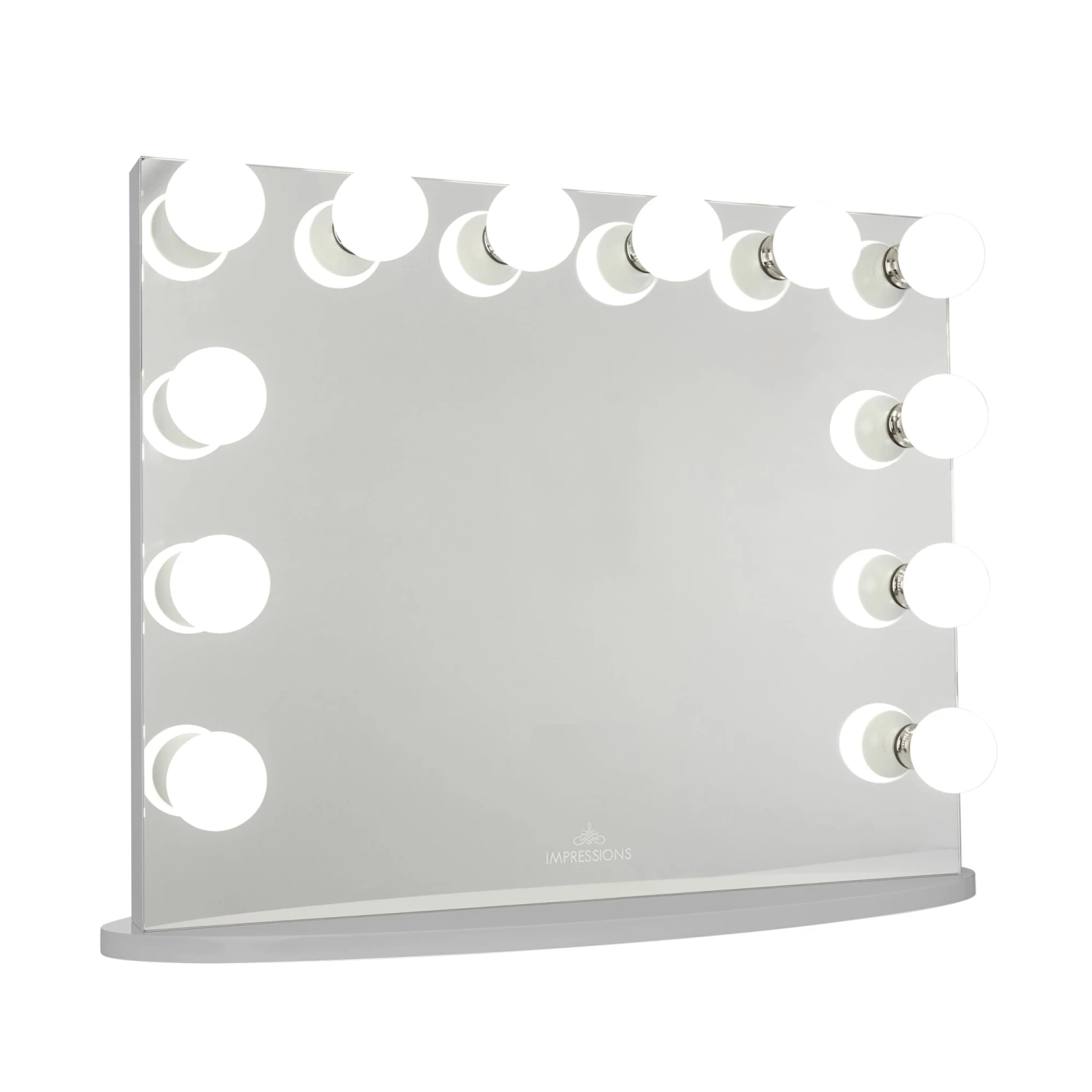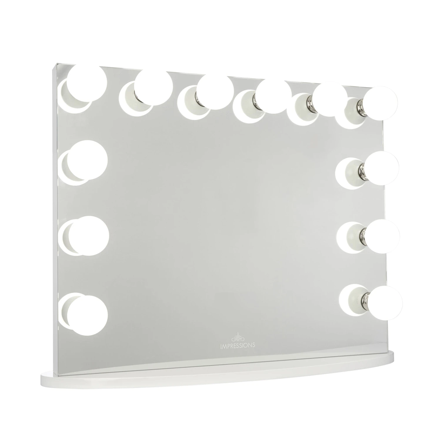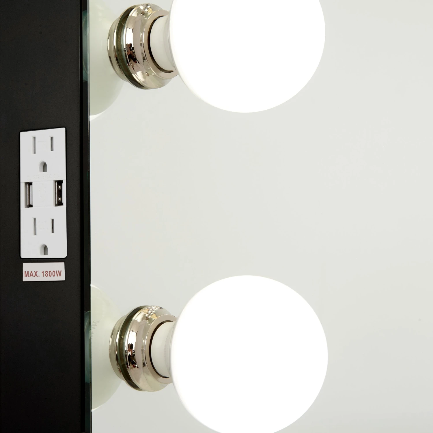 The Impressions Vanity HollywoodPremiere Plus Vanity Mirror is the classic vanity experiencetheHollywood Glam design that provides perfect, even lighting and superior mirror reflection clarity. Featuring 12 light sockets for bright lighting equipped with a dimmer switch and convenient USB andpower outlets. The mirror is encased ina robust aluminum body that can easily be wall-mounted with the pre-installed mounting hardwareormount it on aSlayStationwith the included base!