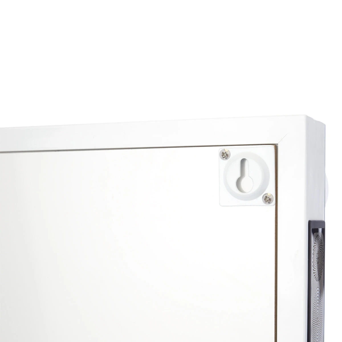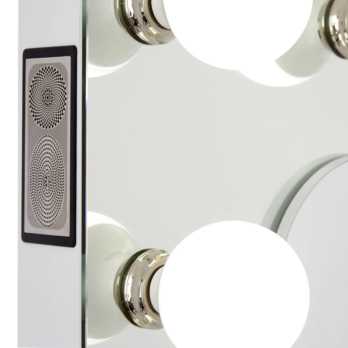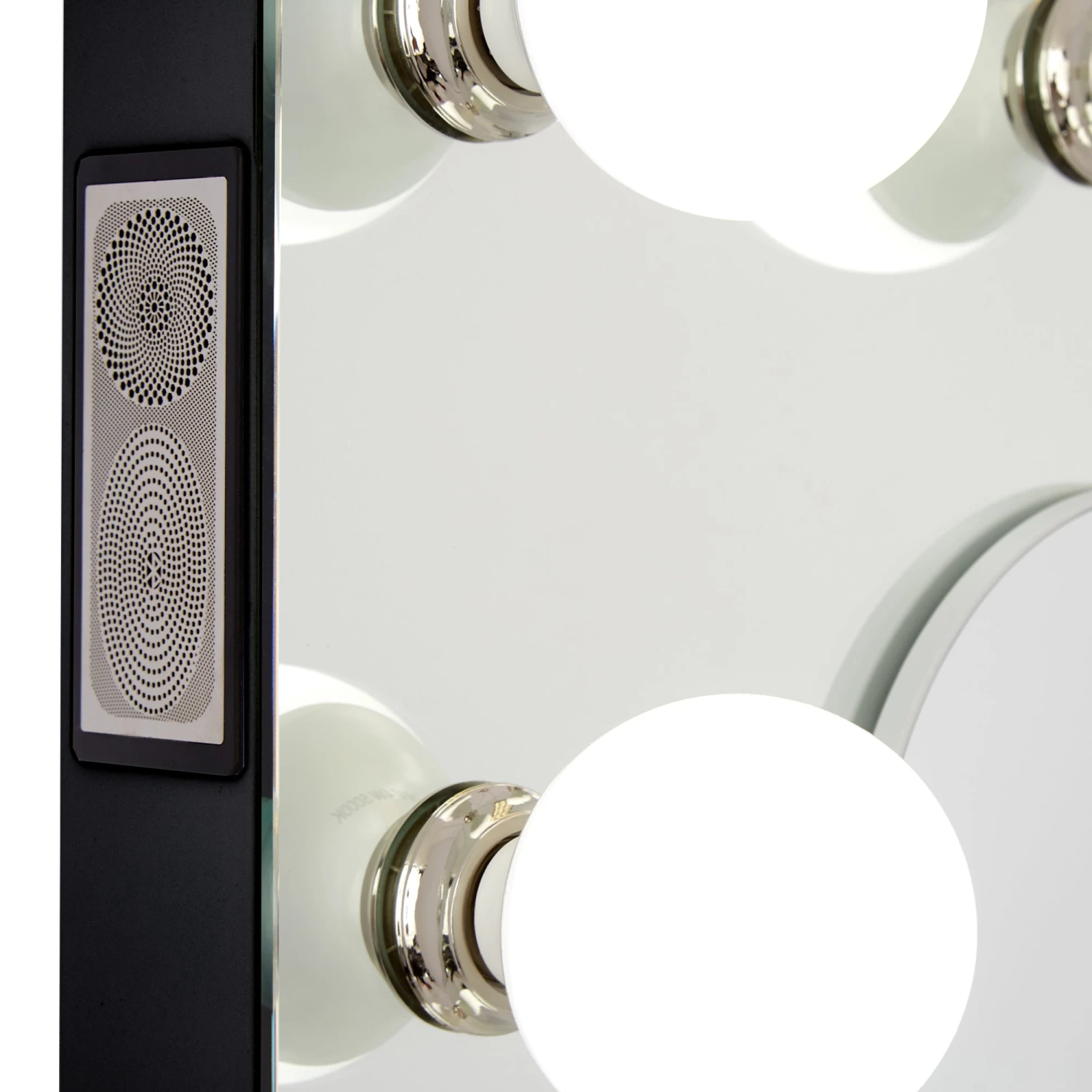 The HollywoodPremiere Plus has the option for wireless Bluetooth speakers with touch-sensitive buttons and backlit LED screen integratedintothe mirror for controlling Bluetooth pairing, volume adjustment. It can also let you check the current temperature to make sure you dont have a makeup meltdown!