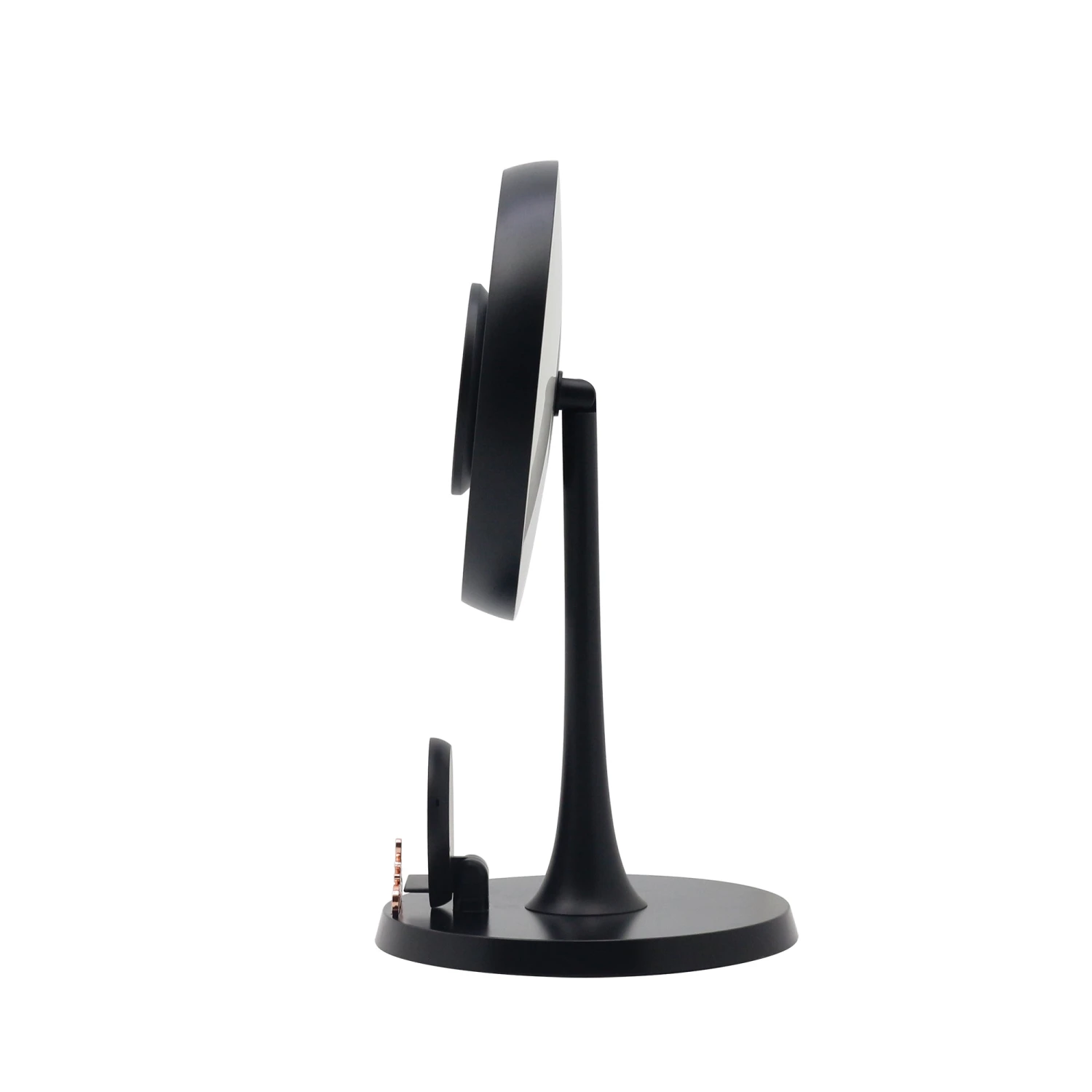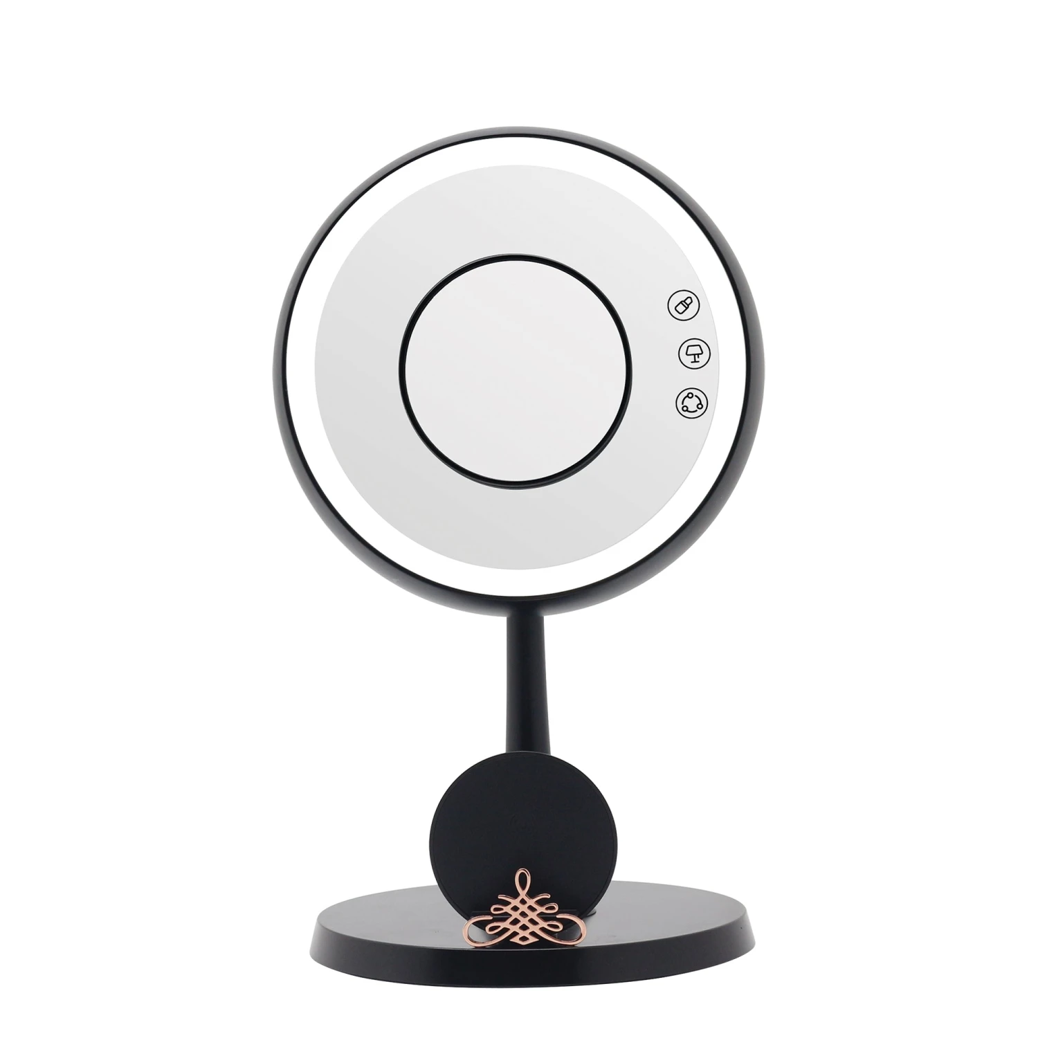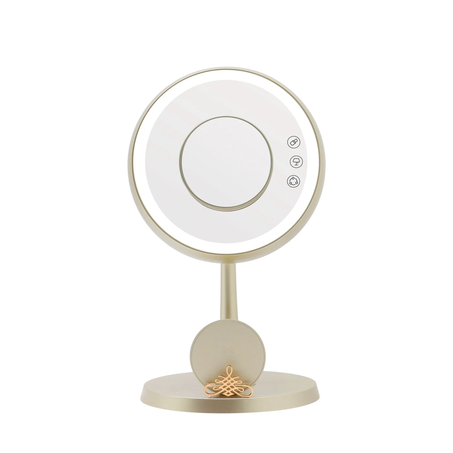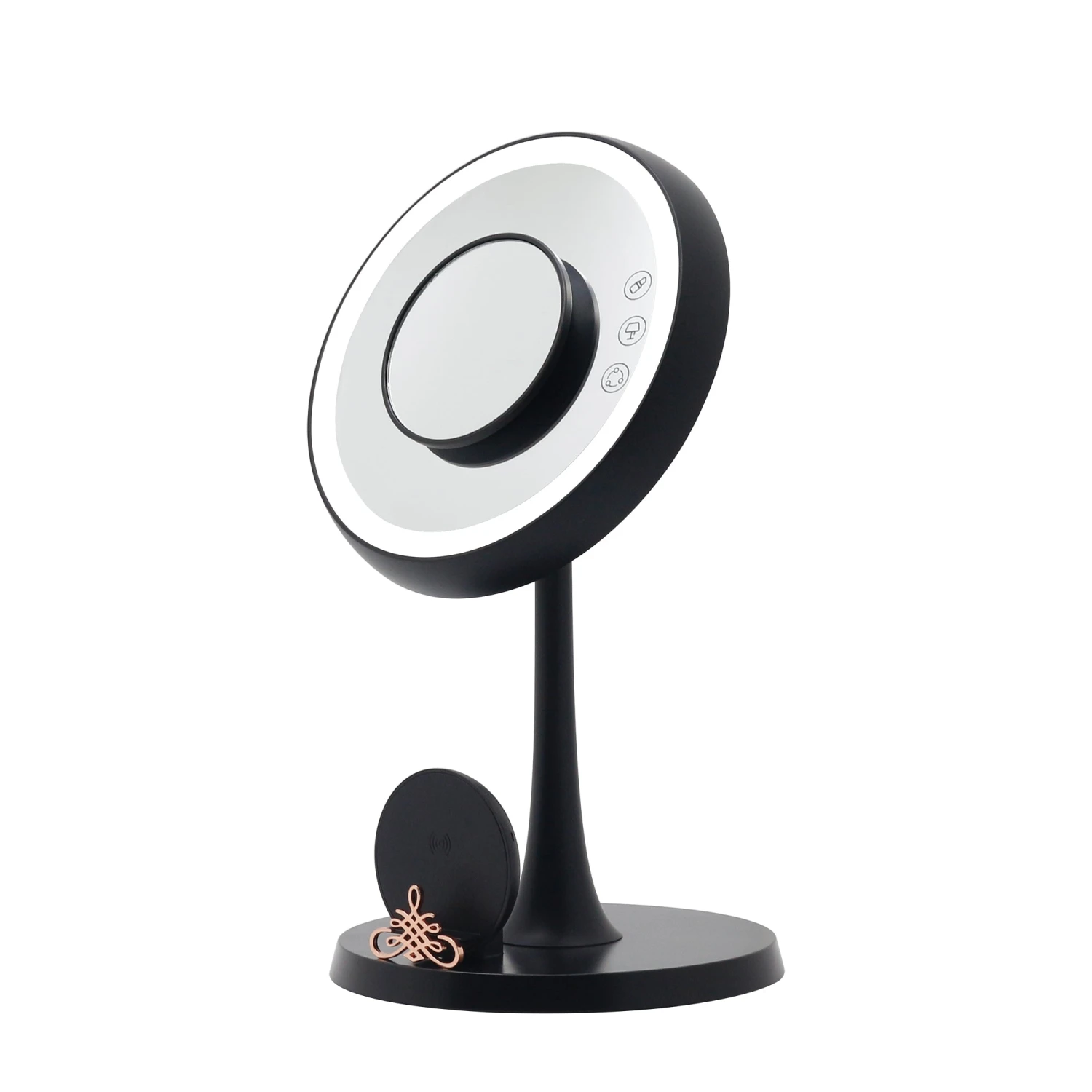 Reach the ultimate level of peace and tranquility with the multi-faceted tri-tone LED lamp mirror, the Serenity. Download the Impressions Glow app to enjoy the many innovative features and customizable functions. This stylish makeup mirror offers a base plate to store your most precious jewelry items. The round framed mirror itself offers a 360 degree tilt along with a soft touch dimmable sensor switch. A 5x magnifying mirror comes included.