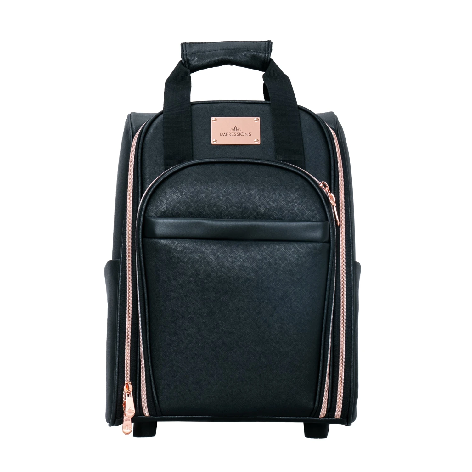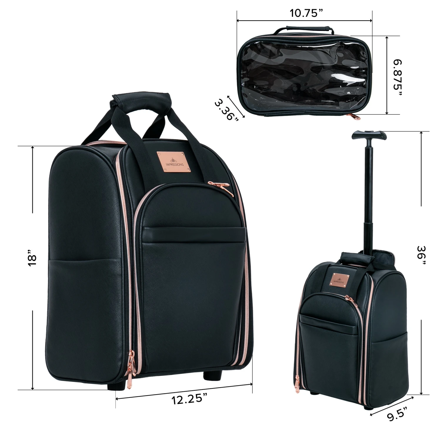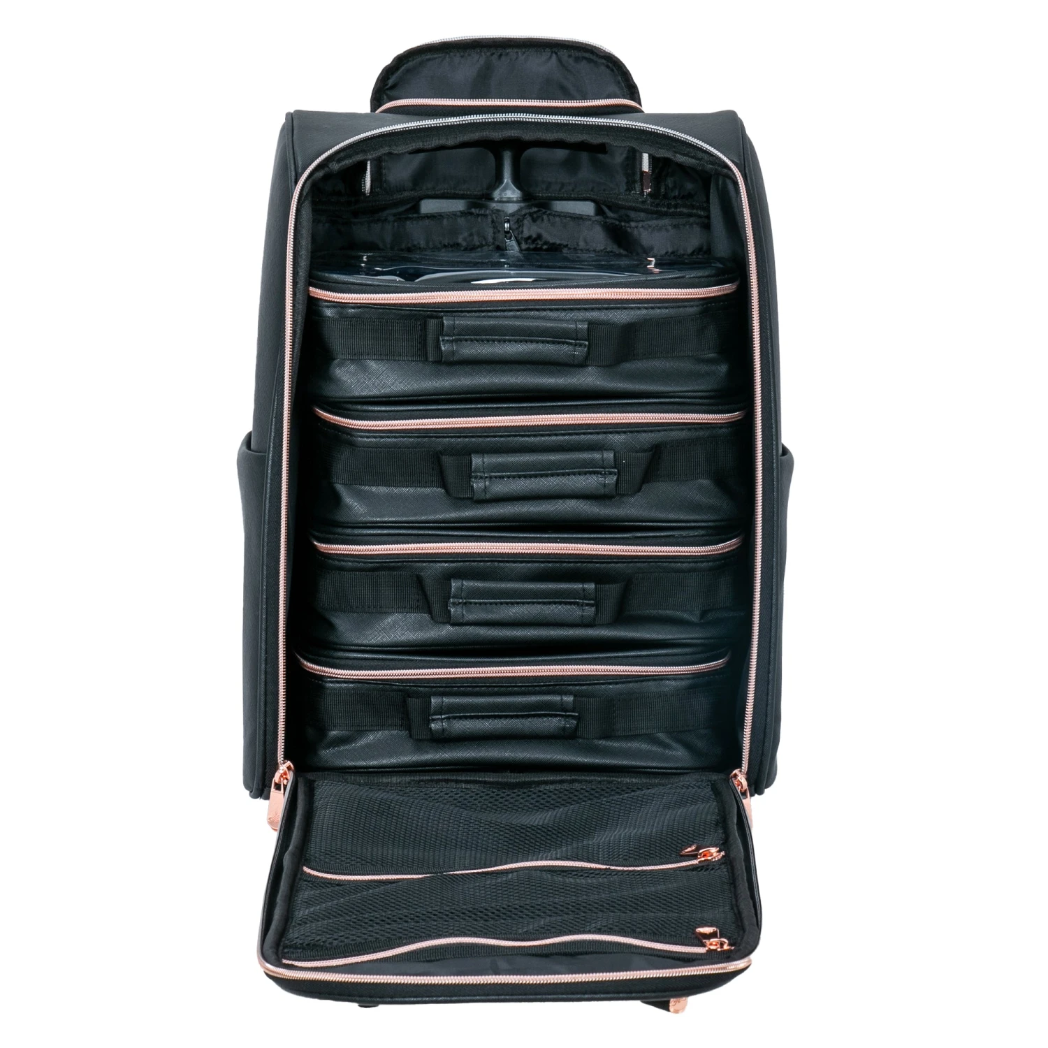 The Impressions Vanity SLAYssentials LUXETravel Organizer Makeup Case, features high-quality faux leather exterior with contrast rose gold trim, 4 removable pouches to help organize all your makeup accessories, extendable handle and wheels that make traveling a breeze.