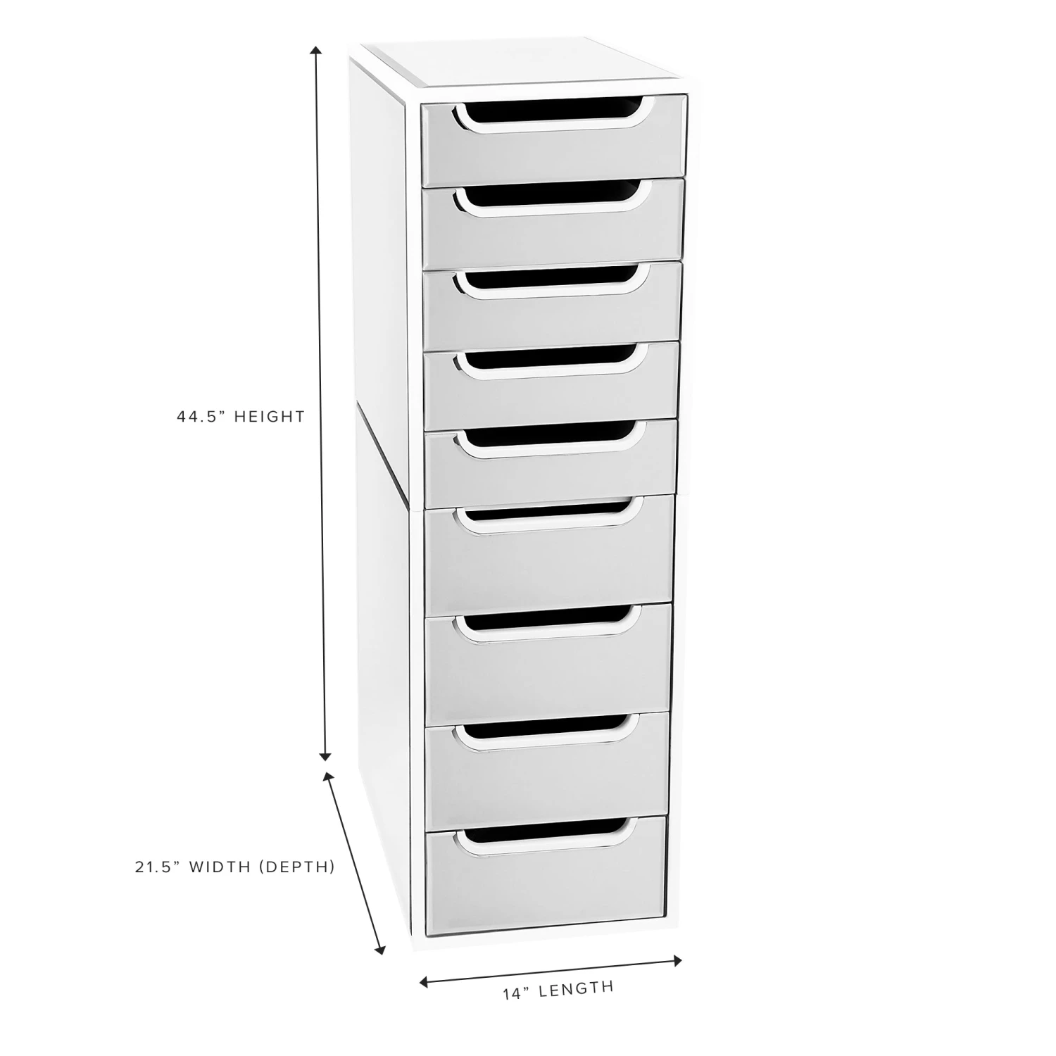 Combine style and functionality with the Aria-9-Drawer! This gorgeous piece features mirrored side panels, mirrored top, and mirrored drawers. Do you ever get the impression that we love mirrors?