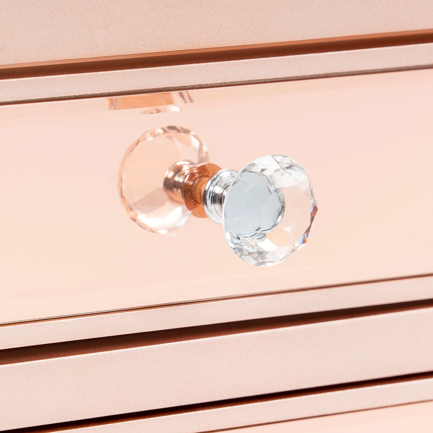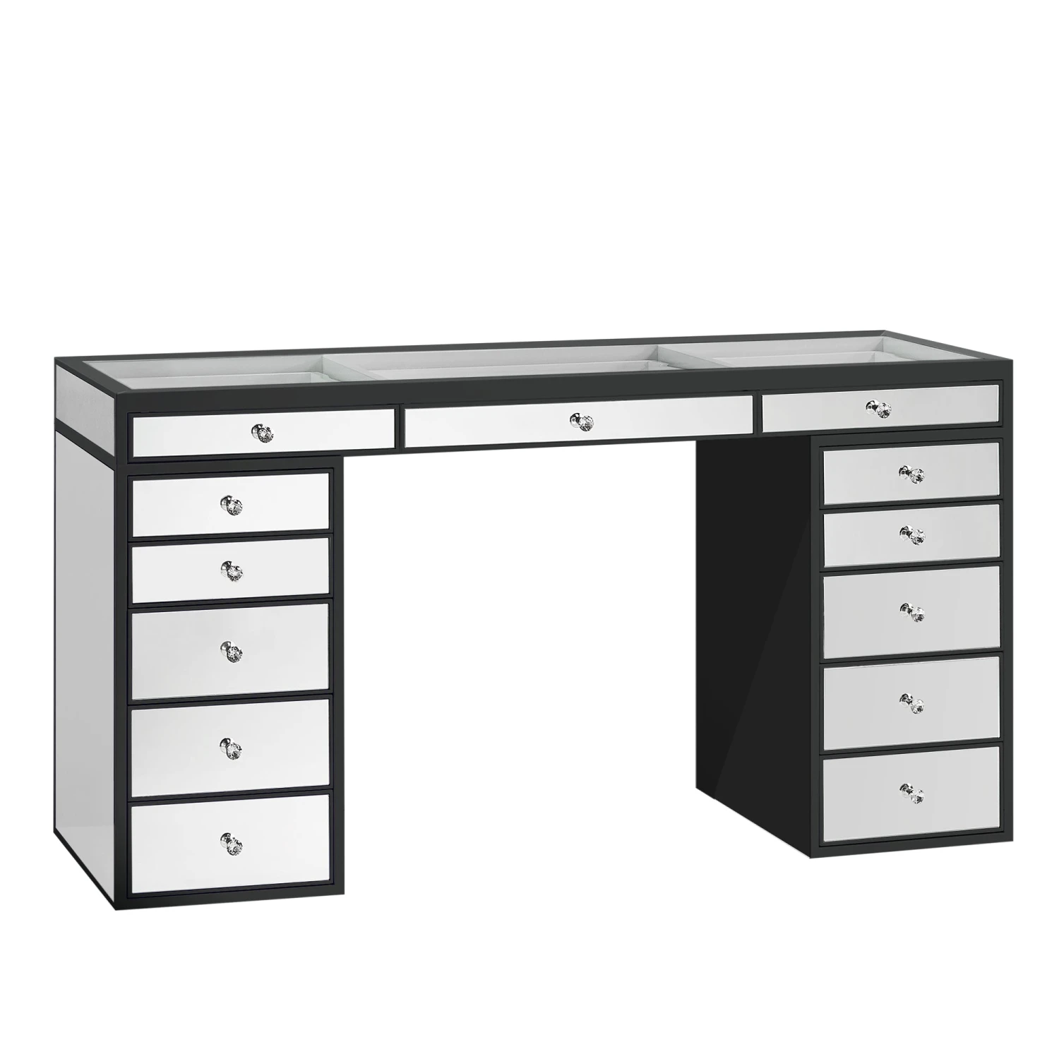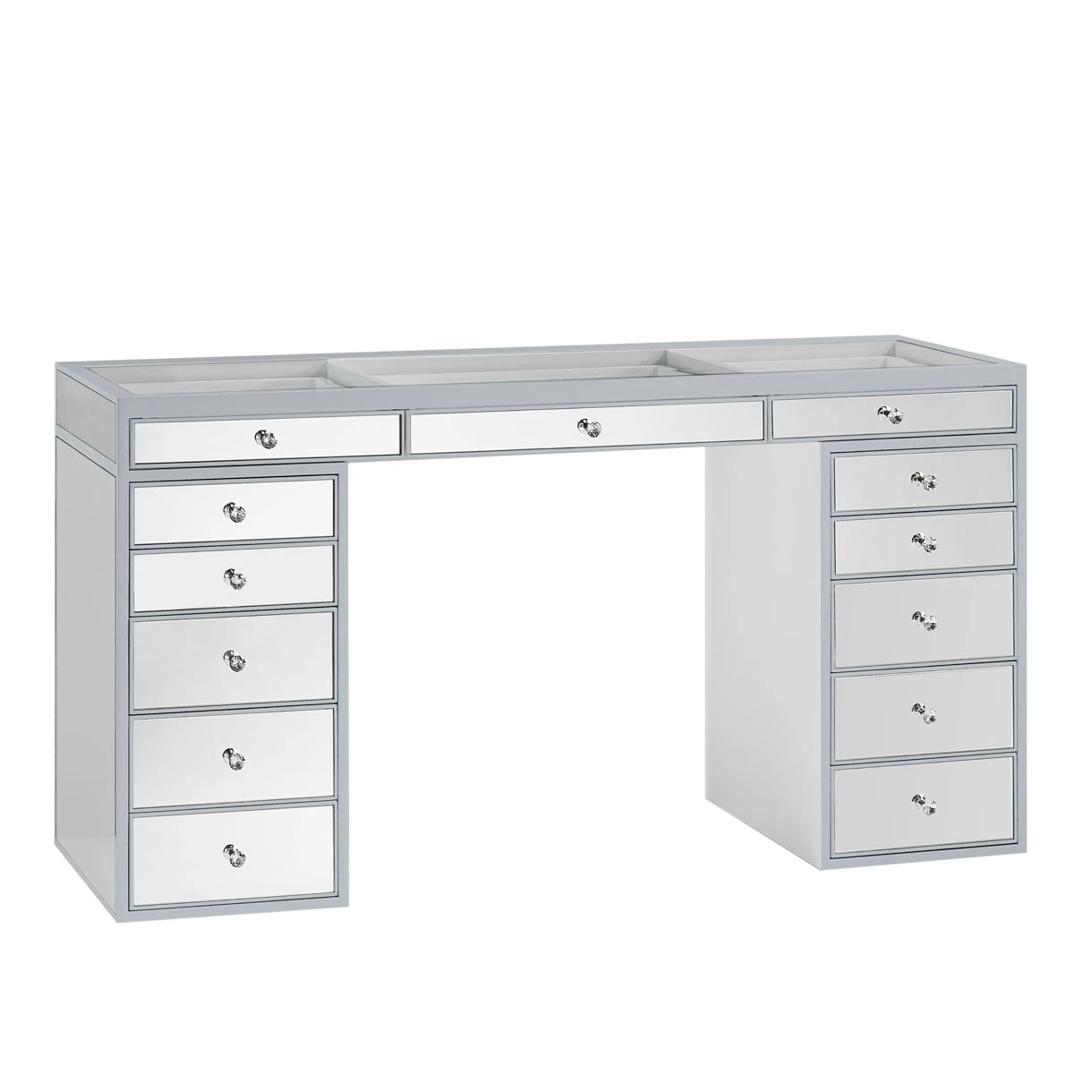 Our flagship SlayStation Pro Premium Mirrored Vanity Table inspires awe with a harmonious balance of understated elegance and grandiose presence. This SlayStation features all-mirrored facades, mirroreddrawers with our luxurious light-catching Crystal Lux Drawer Knobs.