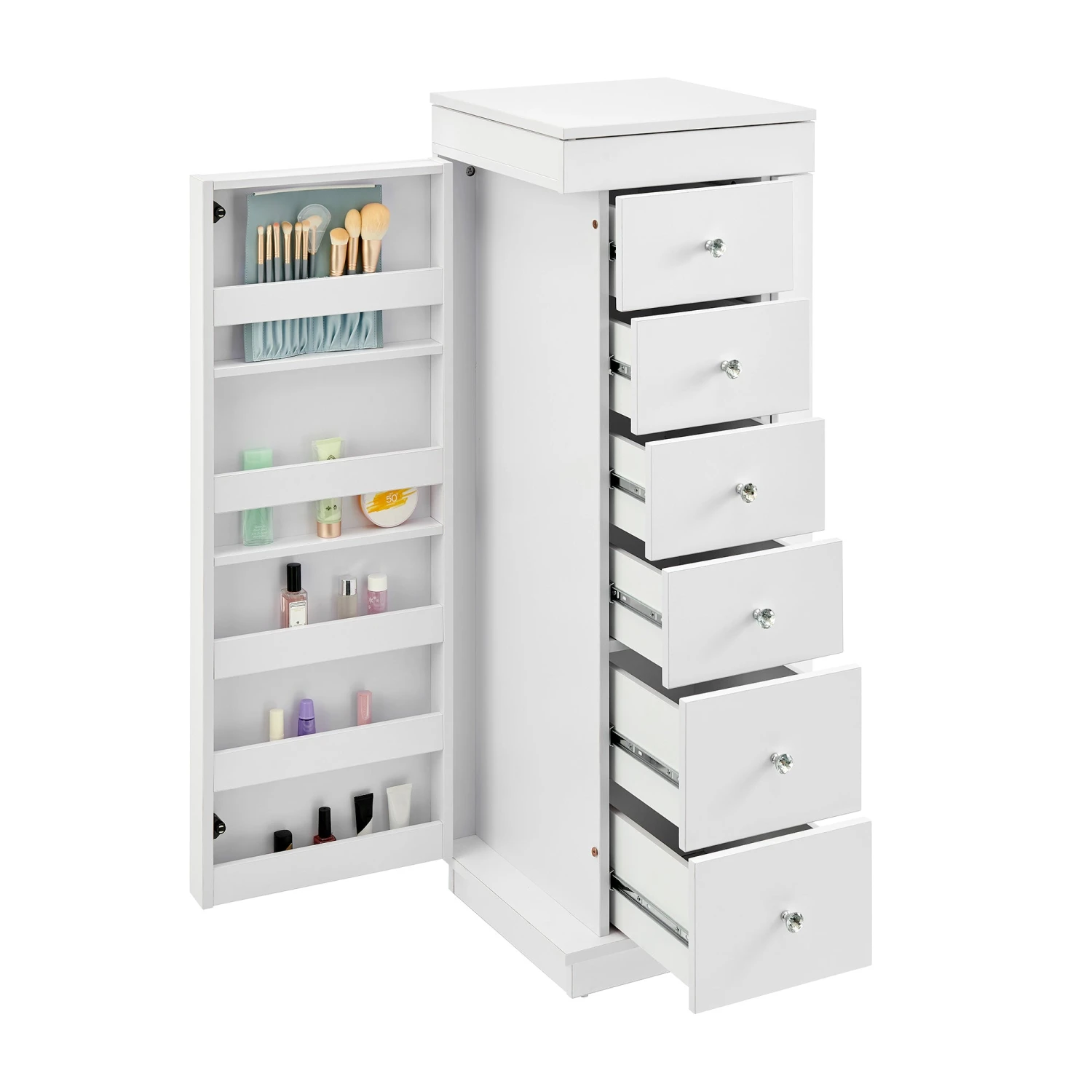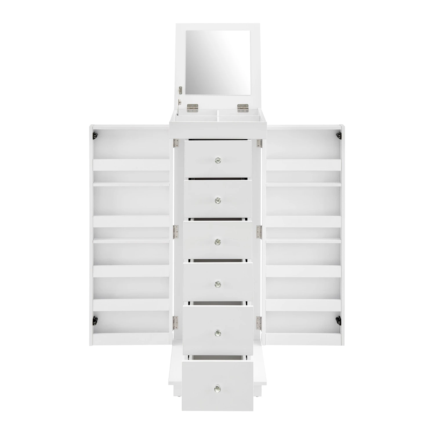 Storage space has never been so glamorous!Introducing the SlayStation Storage Armoire, this elegant piece is packed with drawers, compartments and cabinets. The Armoire featuressix drawers, cabinet space on either side and a lift-up, mirrored top. This freestanding cabinet is designed to promote easy access to makeup, jewelry, skincare, or daily necessities in one stop. It is sturdy and accessible with many unique features and a contemporary design that allows for multiple purposes and functions. This stylish storage armoire works for any style decor.