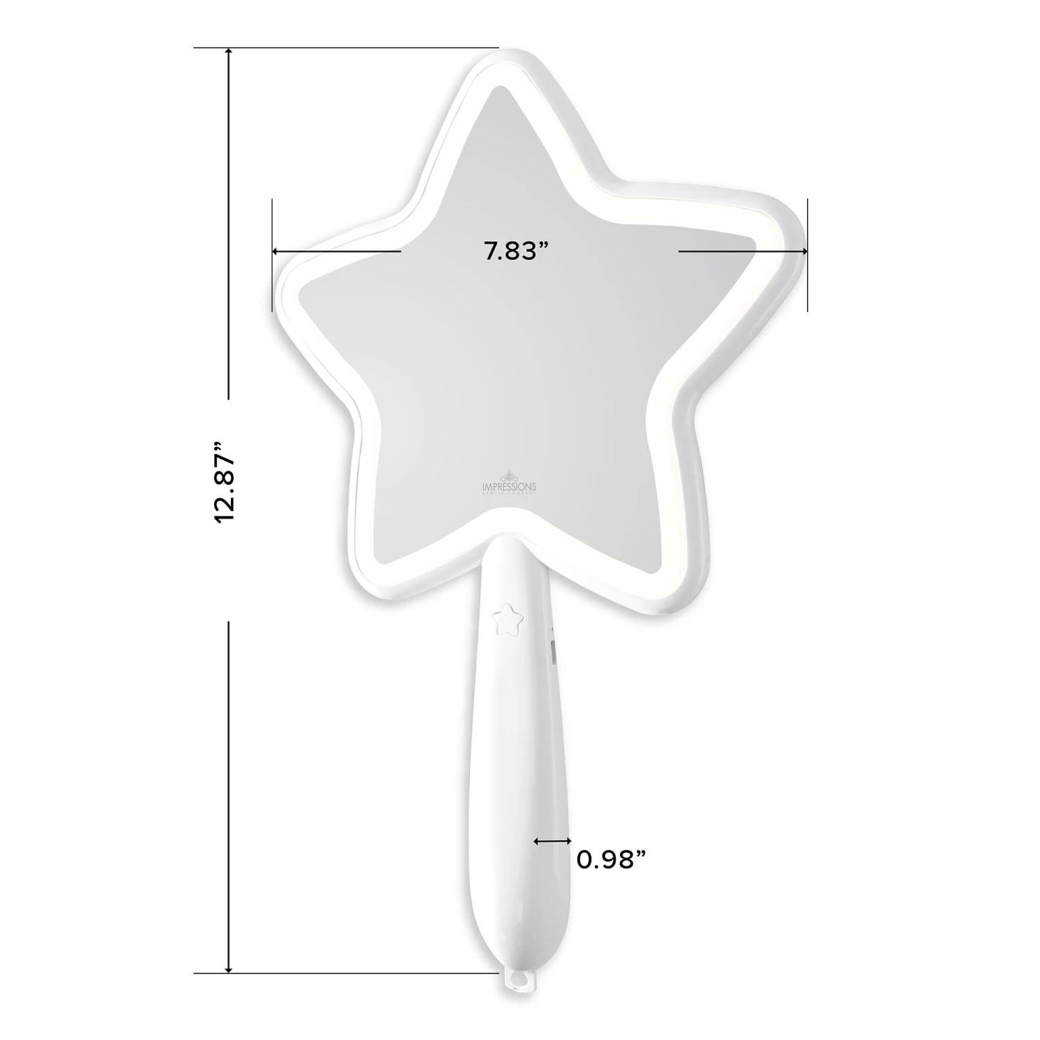 Be the star of the show with The Starlet LED Handheld Makeup Mirror. Featuring a playful star-shaped design and dimmable, long-lasting brightness. The perfect accessory for makeup touch ups with 5x magnification to keep you looking flawless. The extendable hanger at the end of the handle allows you to easily mount on the wall. Simply recharge by plugging in the USB charger.