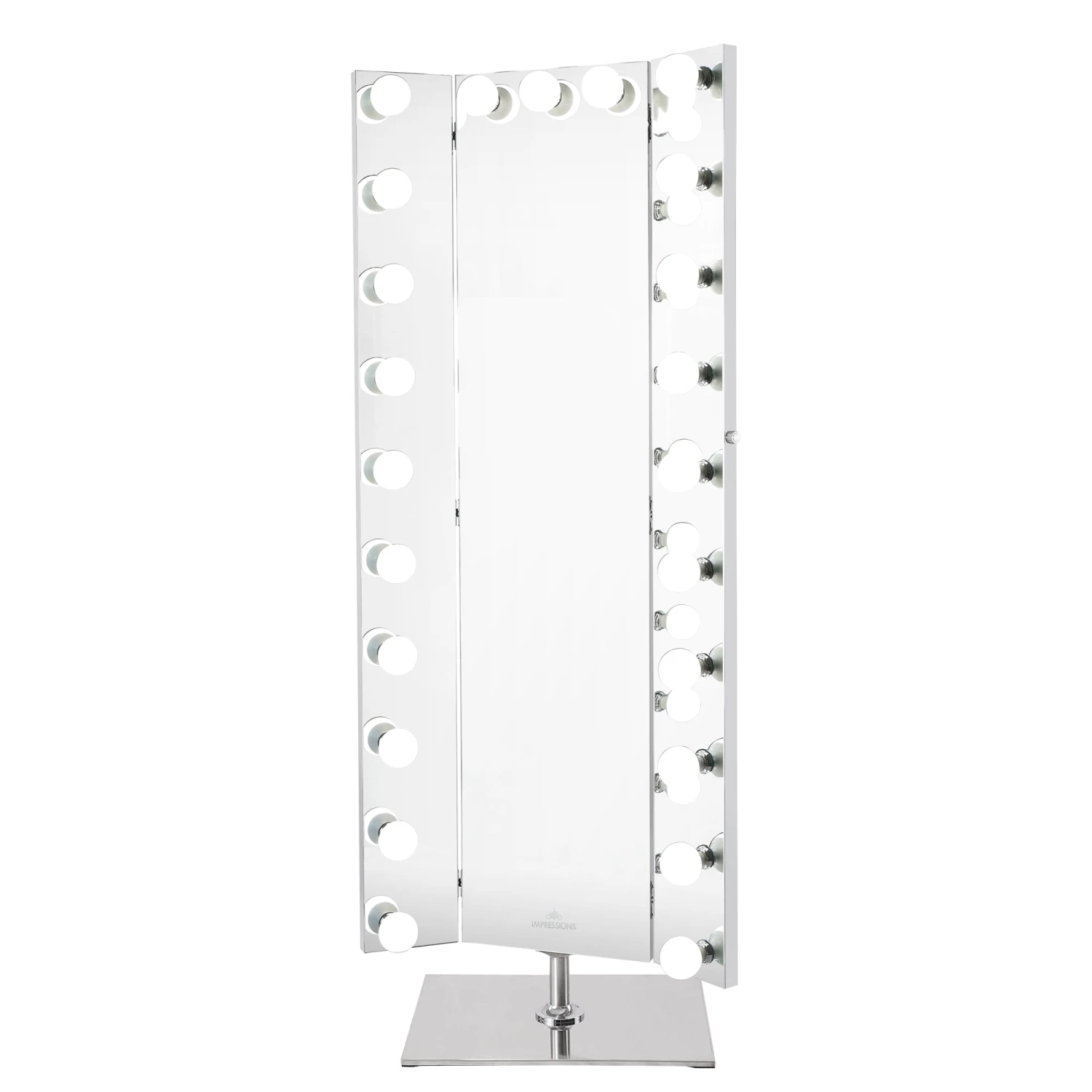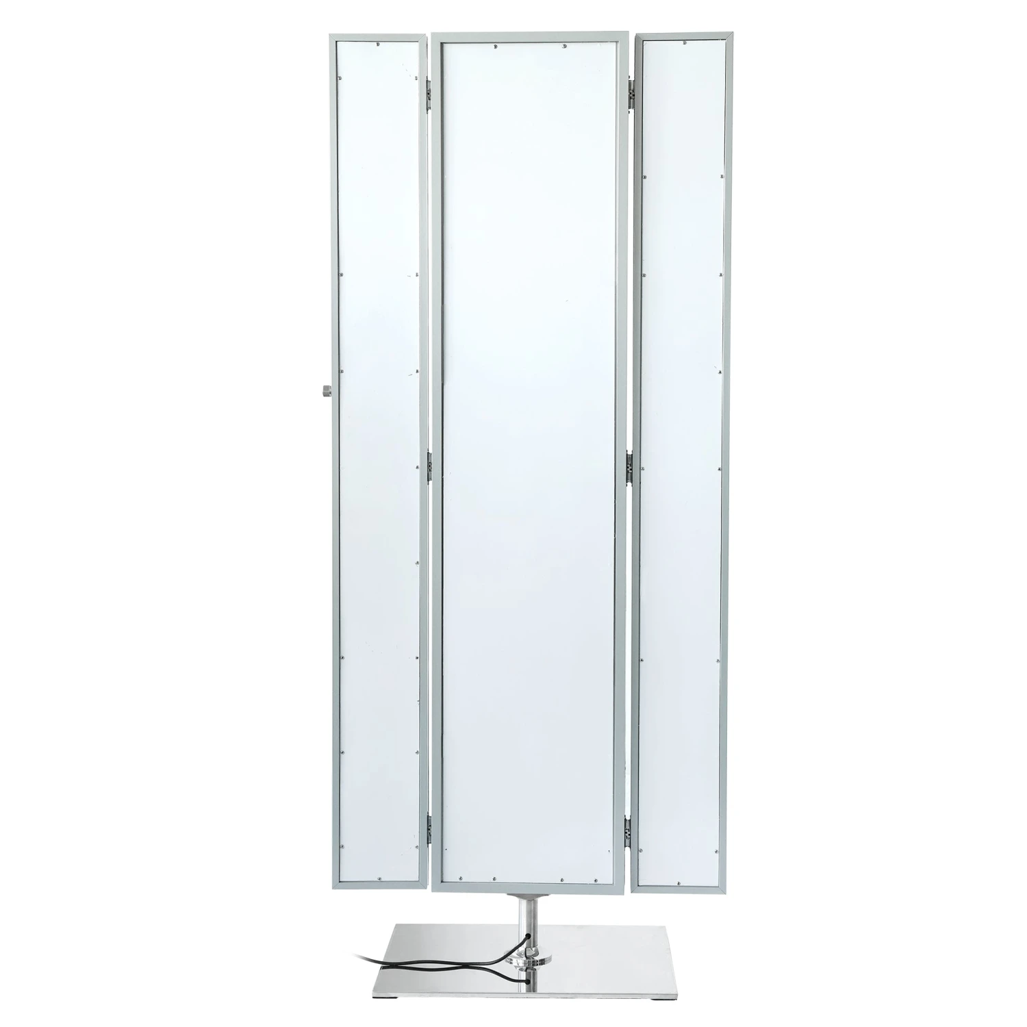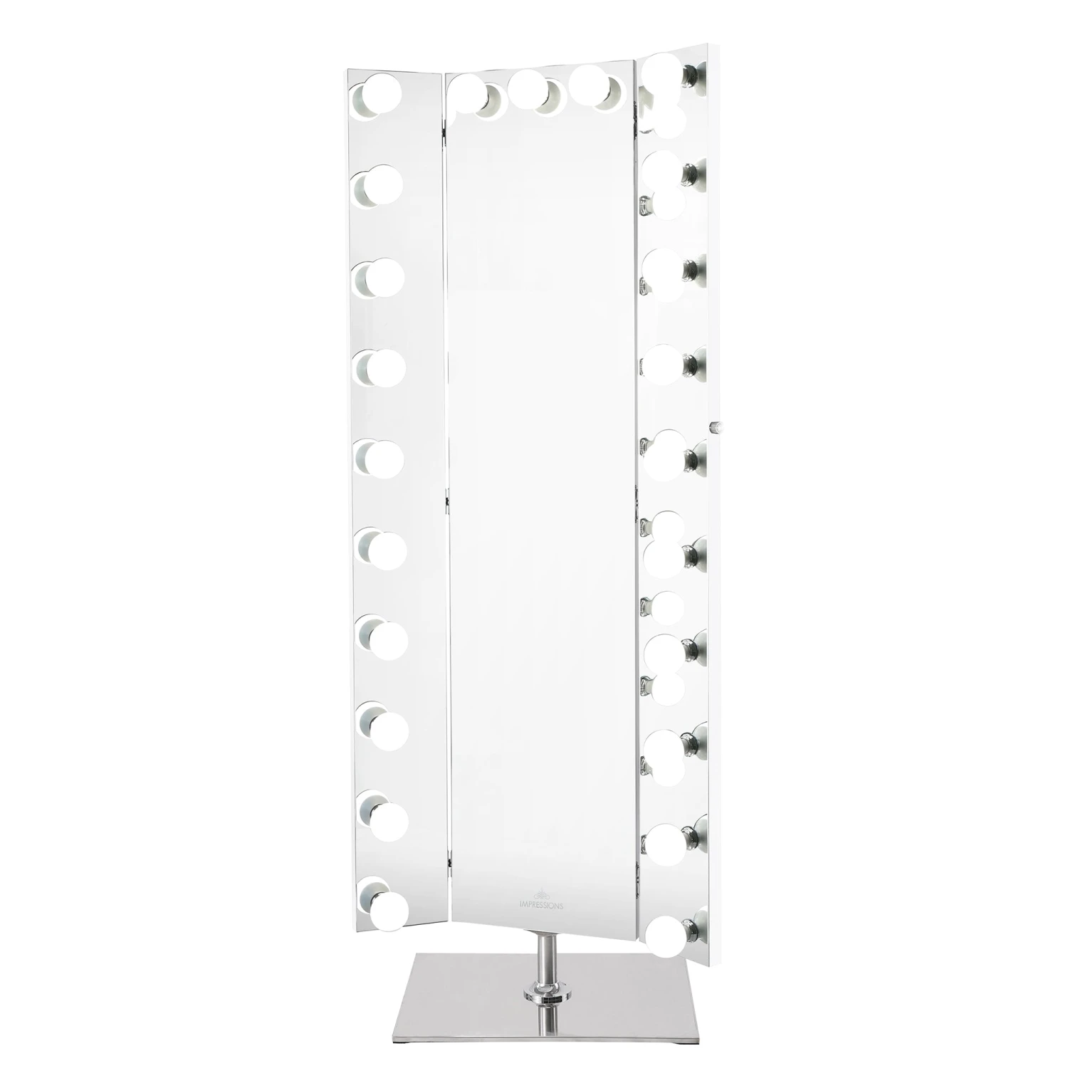 Glamour, warmth and luxury –the trifectaambience obtained with the all new TrifectaFull Length Mirror.Bordered by a high-quality LED light stripor 23LED globebulbs, providing dimmable ultra-bright studio lighting. This trifold vanitymirror adds a touch of elevated radiance to any glam room.(Powered by US standard plug-in cord.)