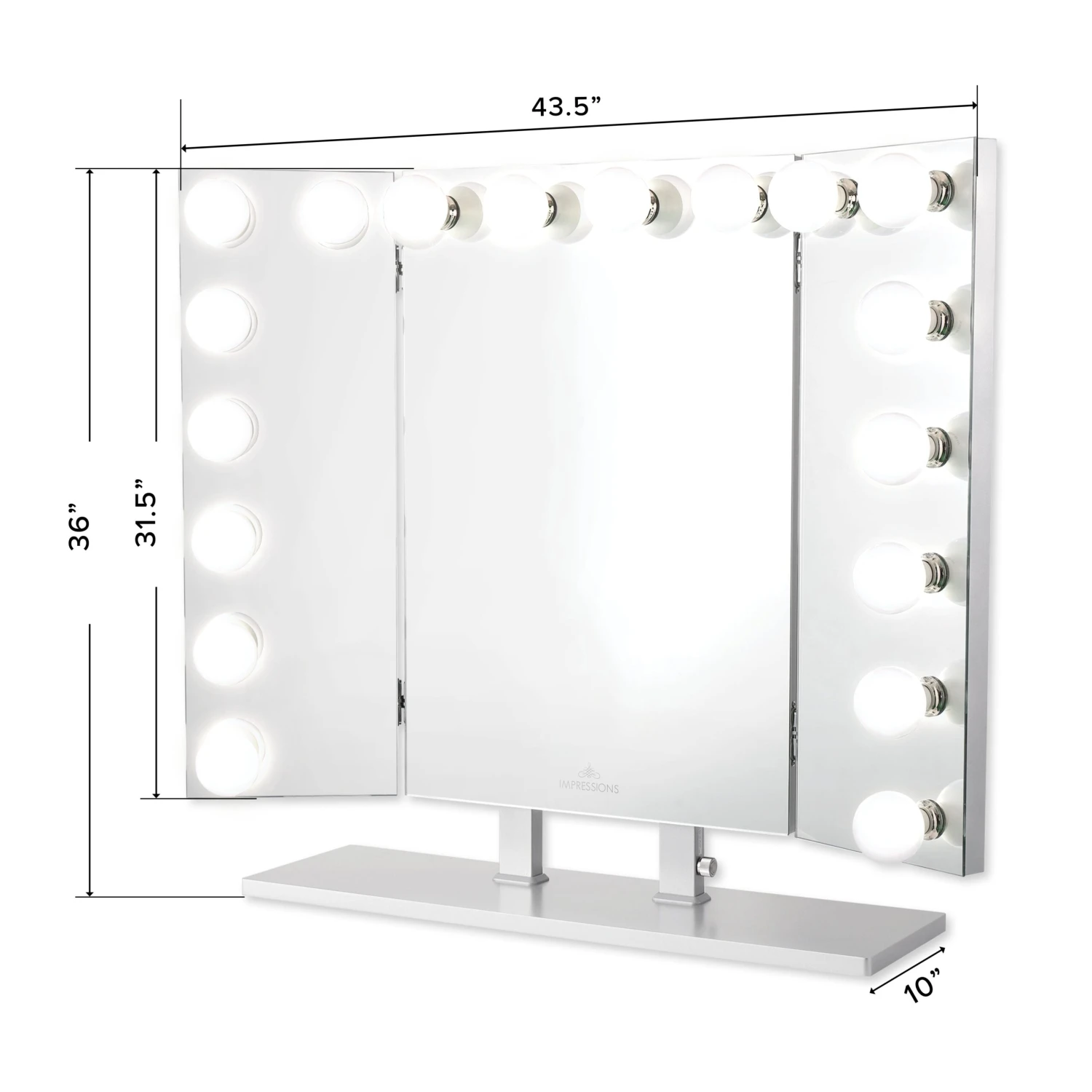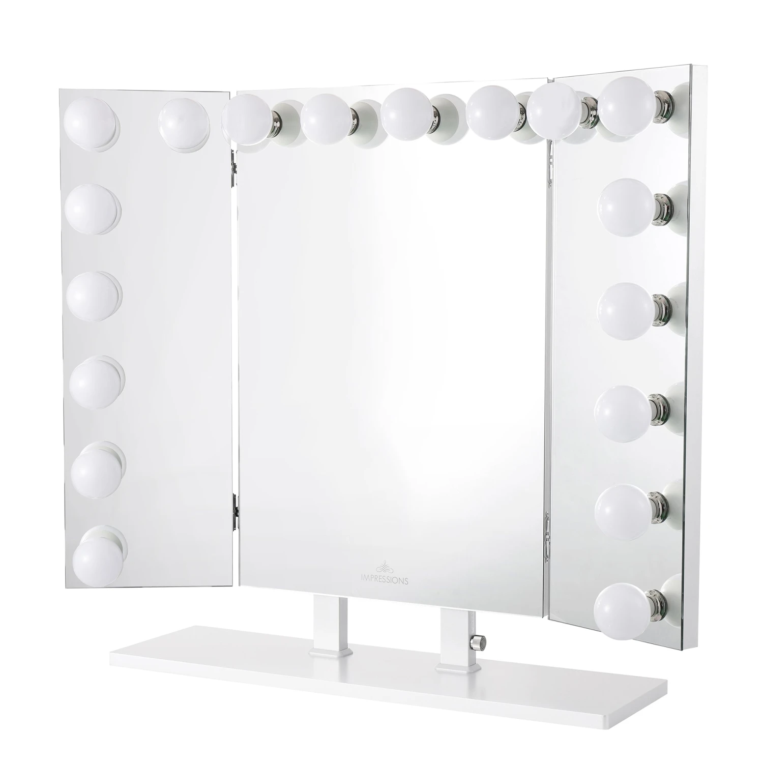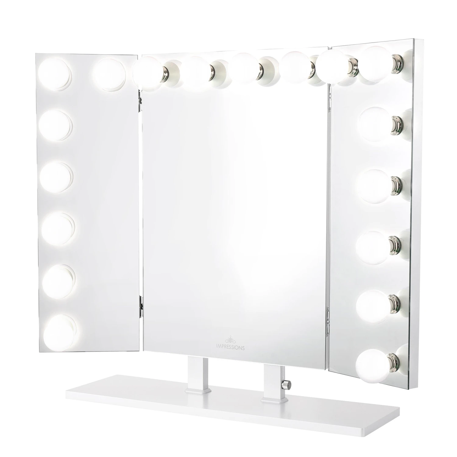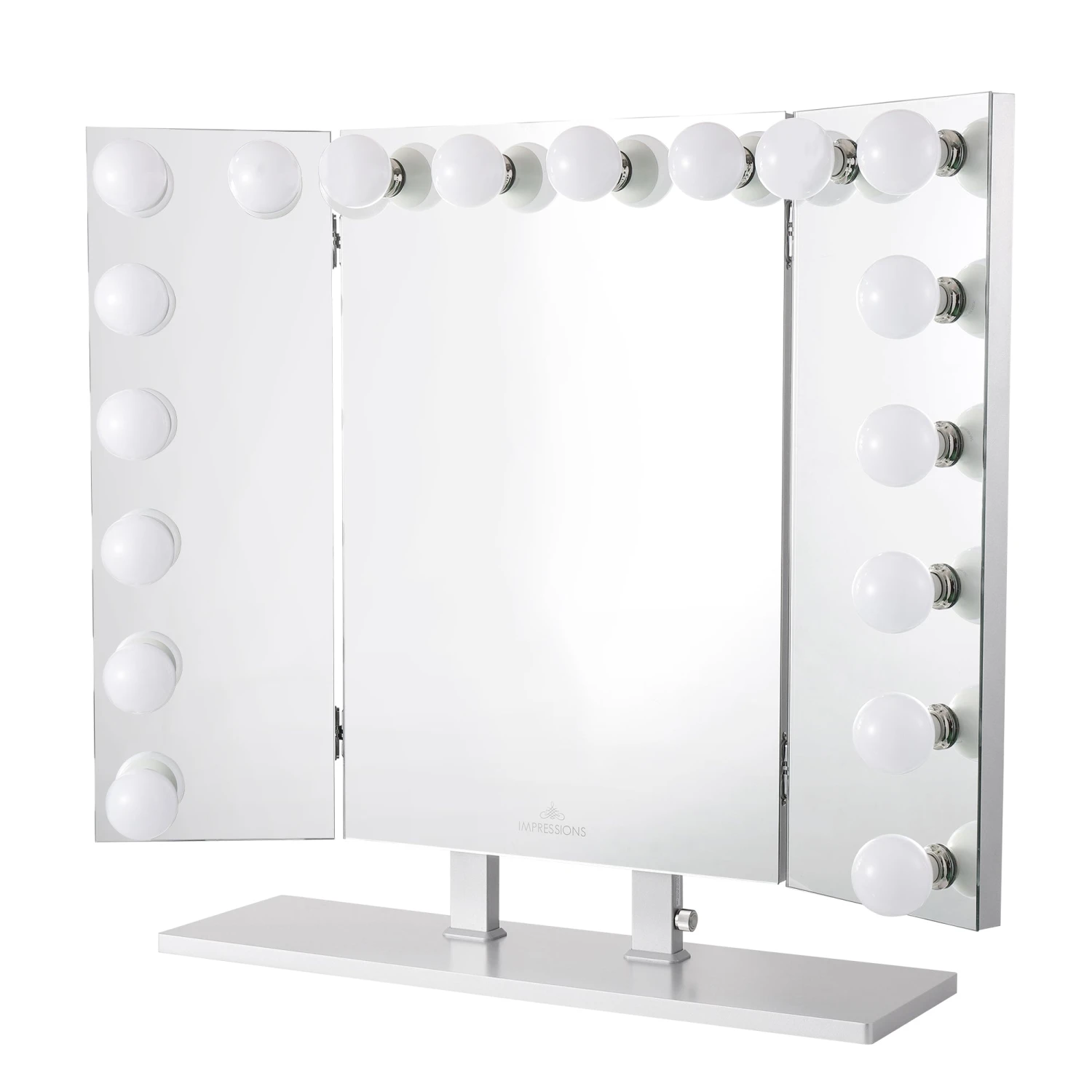 Glamour, warmth, and luxury the trifecta ambience obtained with the all new Trifecta PROVanity Mirror. Bordered by a high-quality LED light strip or 18 LED globe bulbs, providing dimmable ultra-bright studio lighting. This trifold vanitymirror adds a touch of elevated radiance to any glam room.(Powered by US standard plug-in cord.)