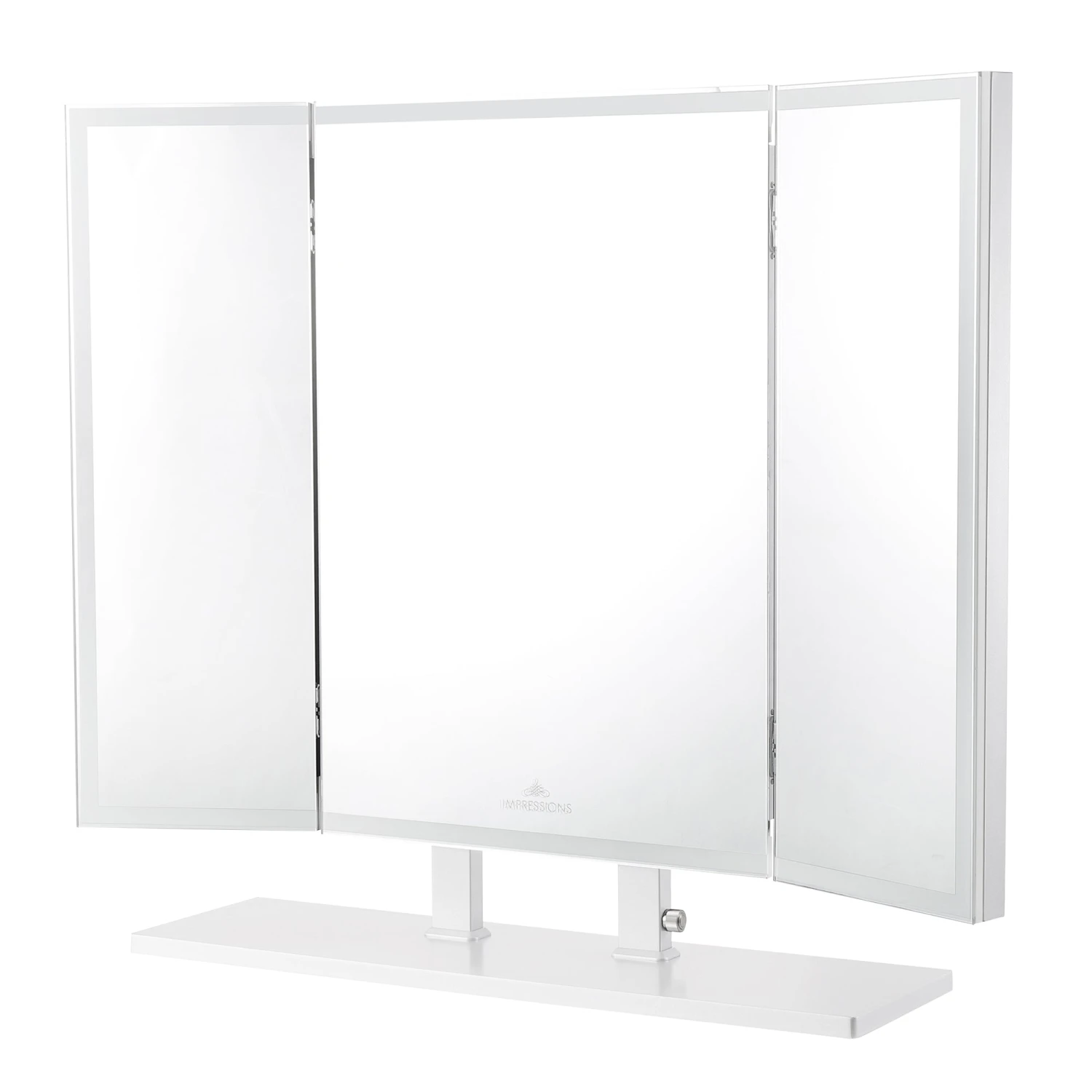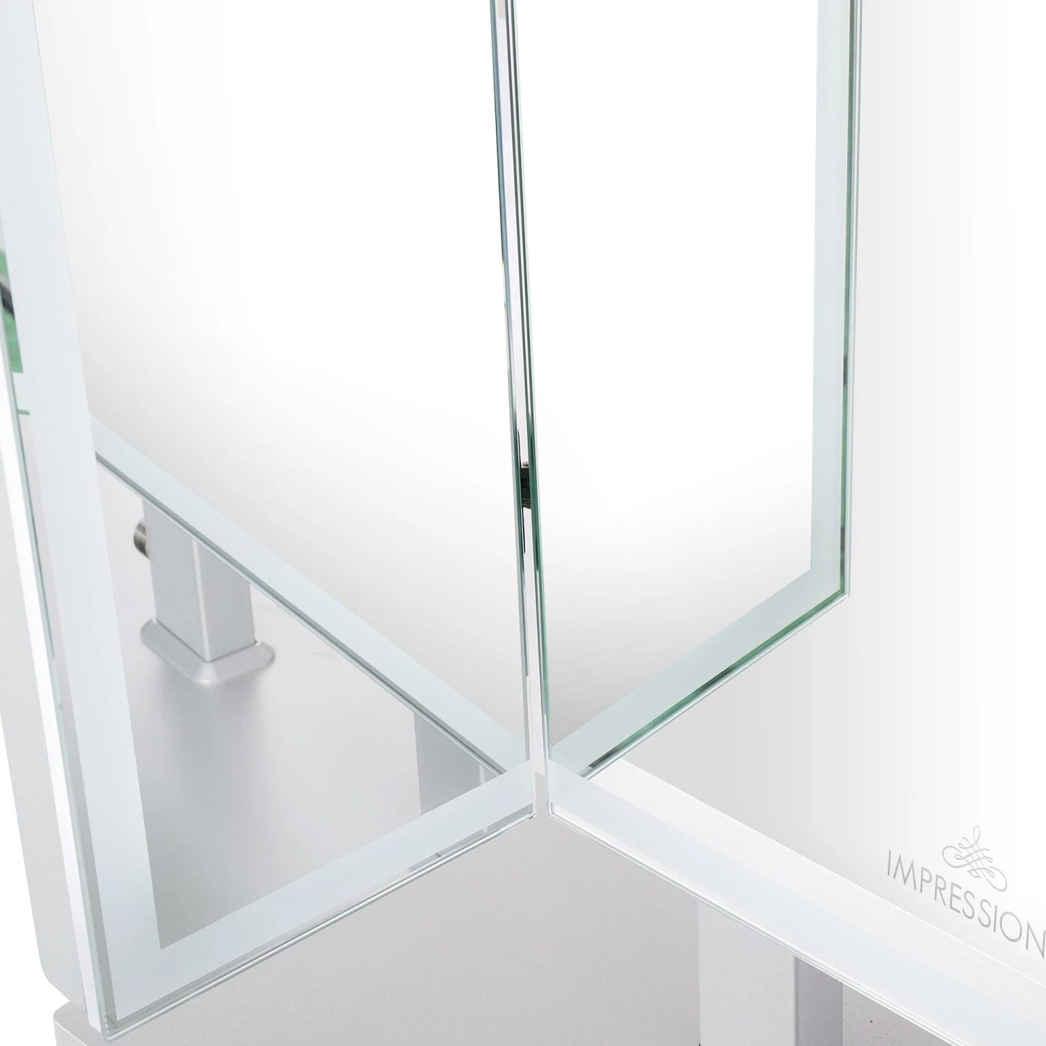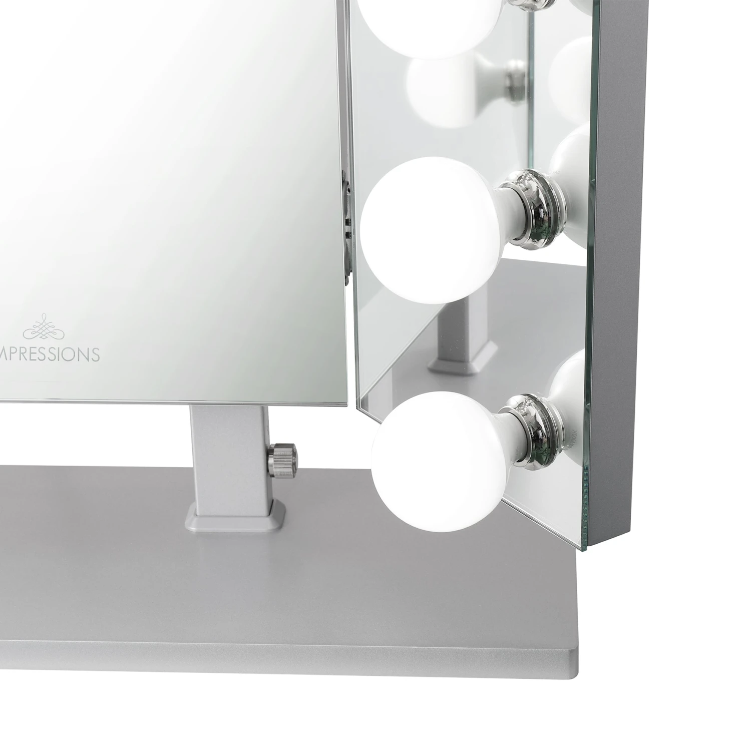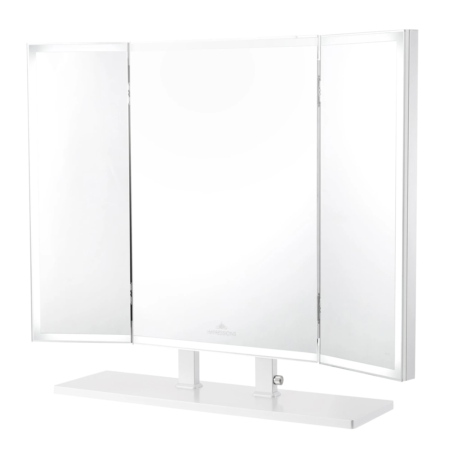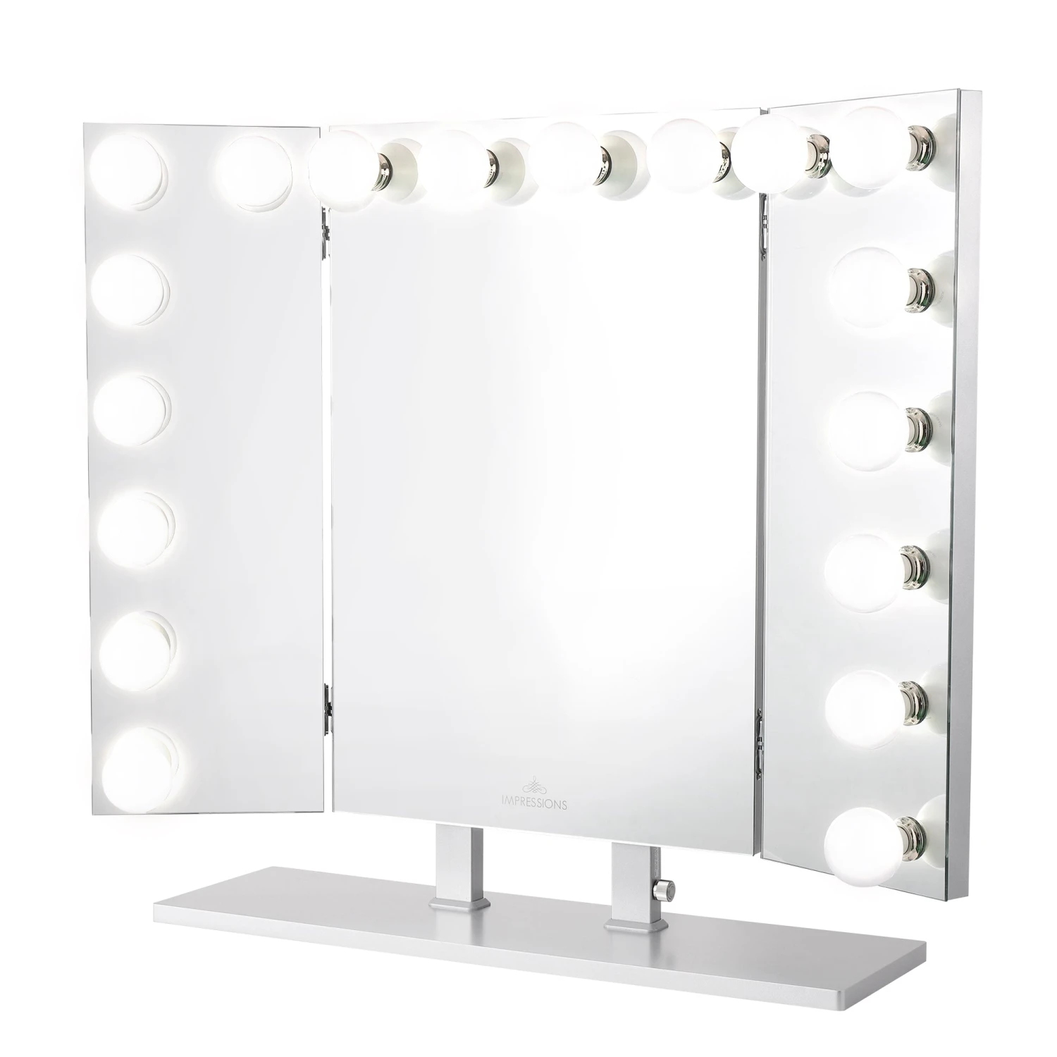 Glamour, warmth, and luxury the trifecta ambience obtained with the all new Trifecta PROVanity Mirror. Bordered by a high-quality LED light strip or 18 LED globe bulbs, providing dimmable ultra-bright studio lighting. This trifold vanitymirror adds a touch of elevated radiance to any glam room.(Powered by US standard plug-in cord.)